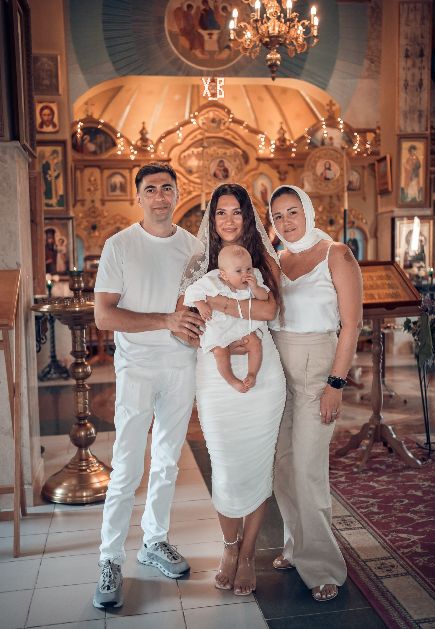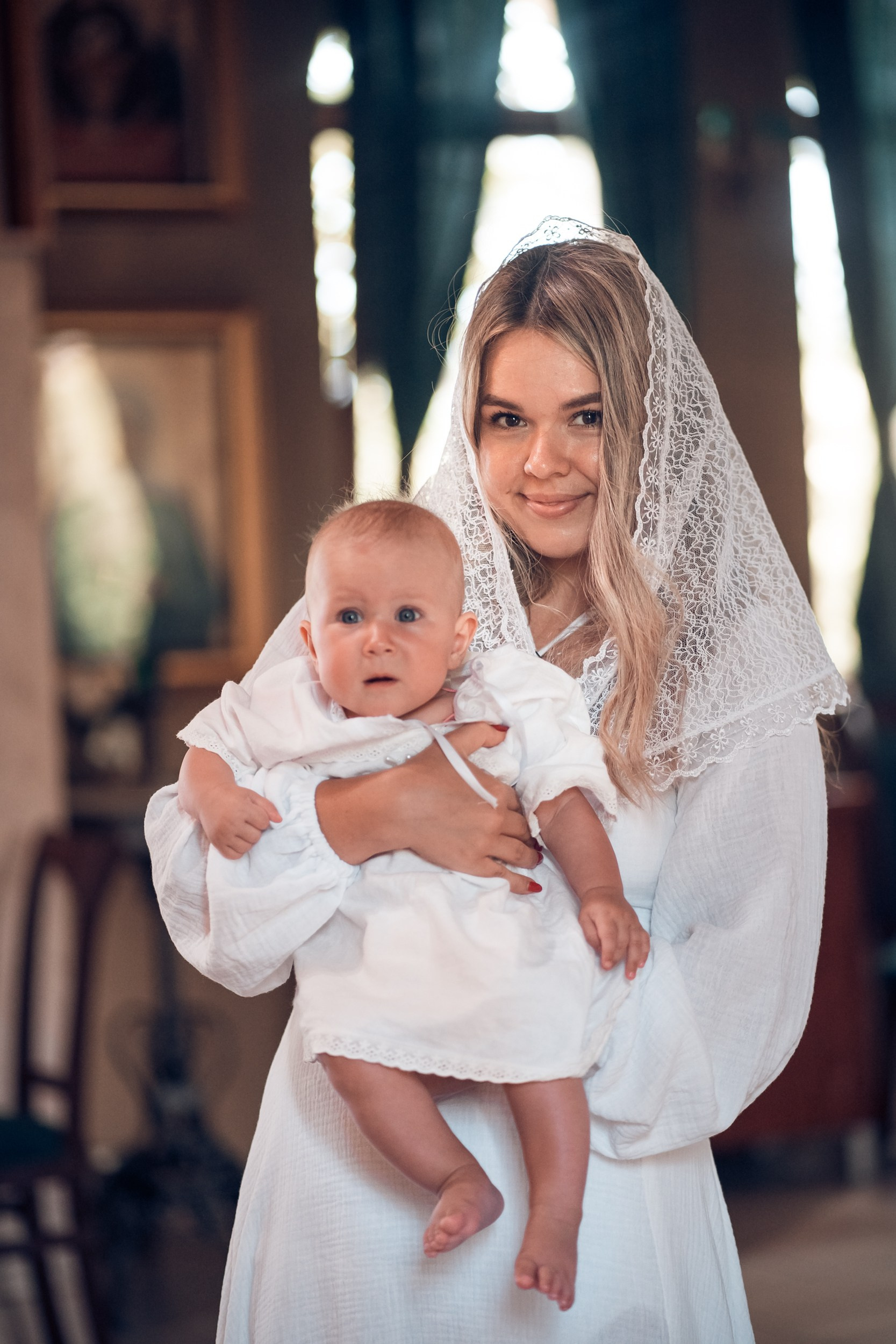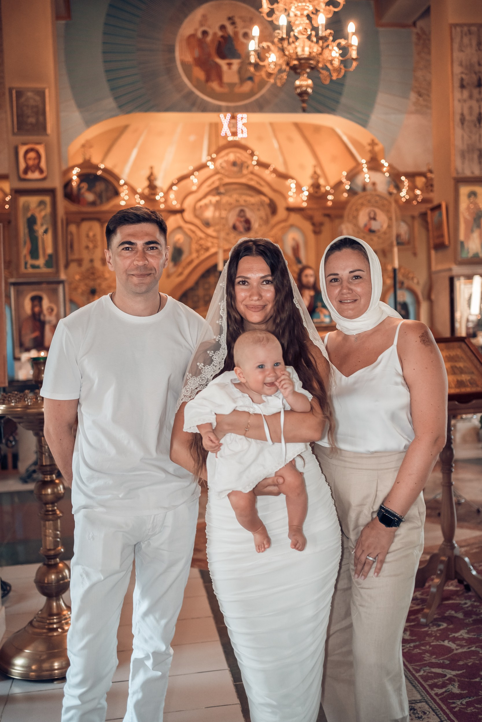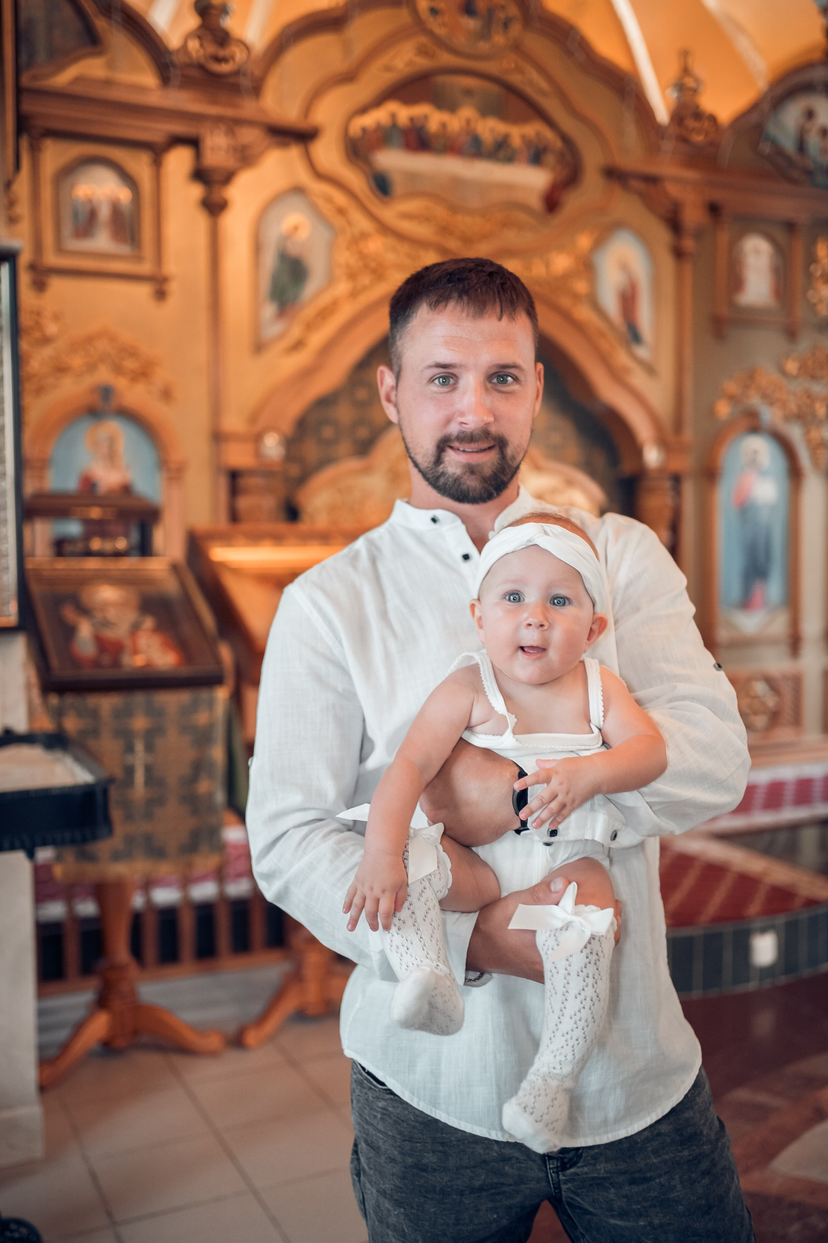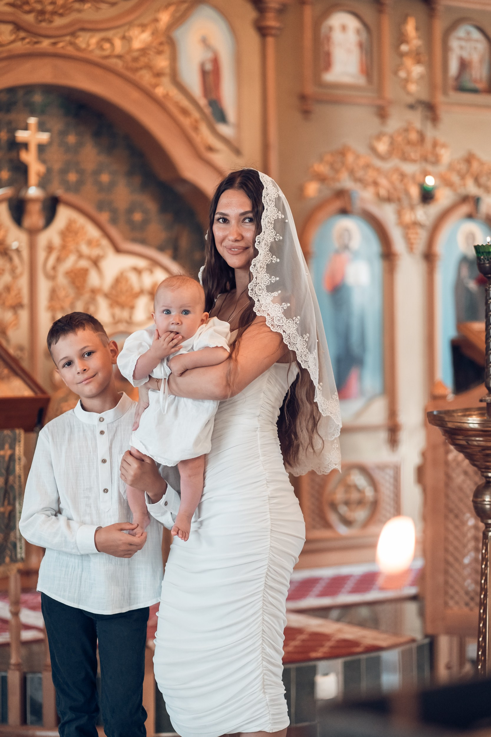 Съемка в 11 часов летнего дня. Стоит учесть. что в храме темные стены и минимальное освещение, поэтому для результата съемки обязательный выбор одежды светлых однотонных расцветок. Для малыша одежда светлых оттенков, наряд до окунания в купель и после купели крестильная рубашка (желательно фасон длинный без капюшона и завязок). Полотенце (крыжма) для принятия крещаемого из купели. Крестик на веревочке. Дополнительно пеленку однотонную.