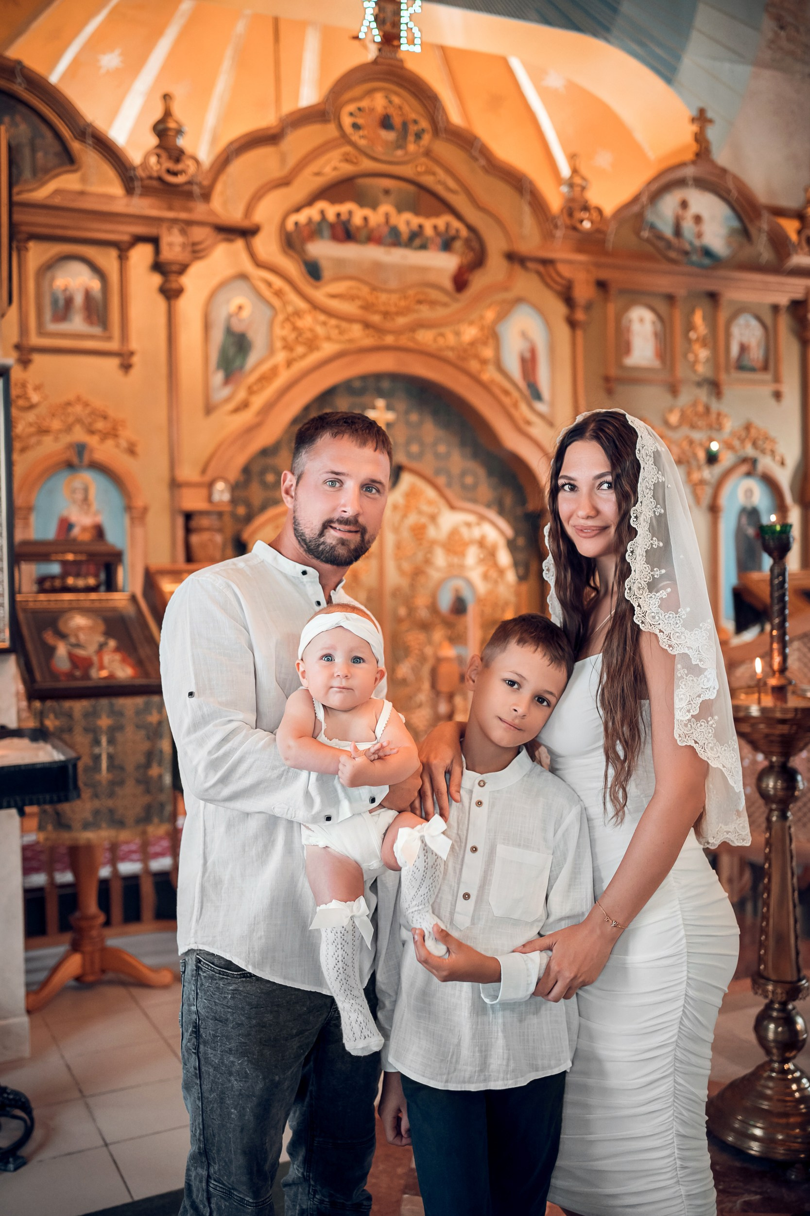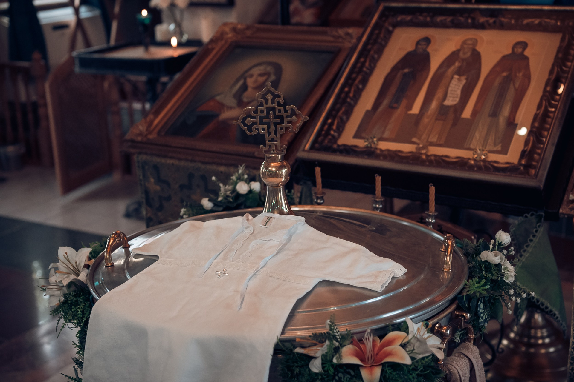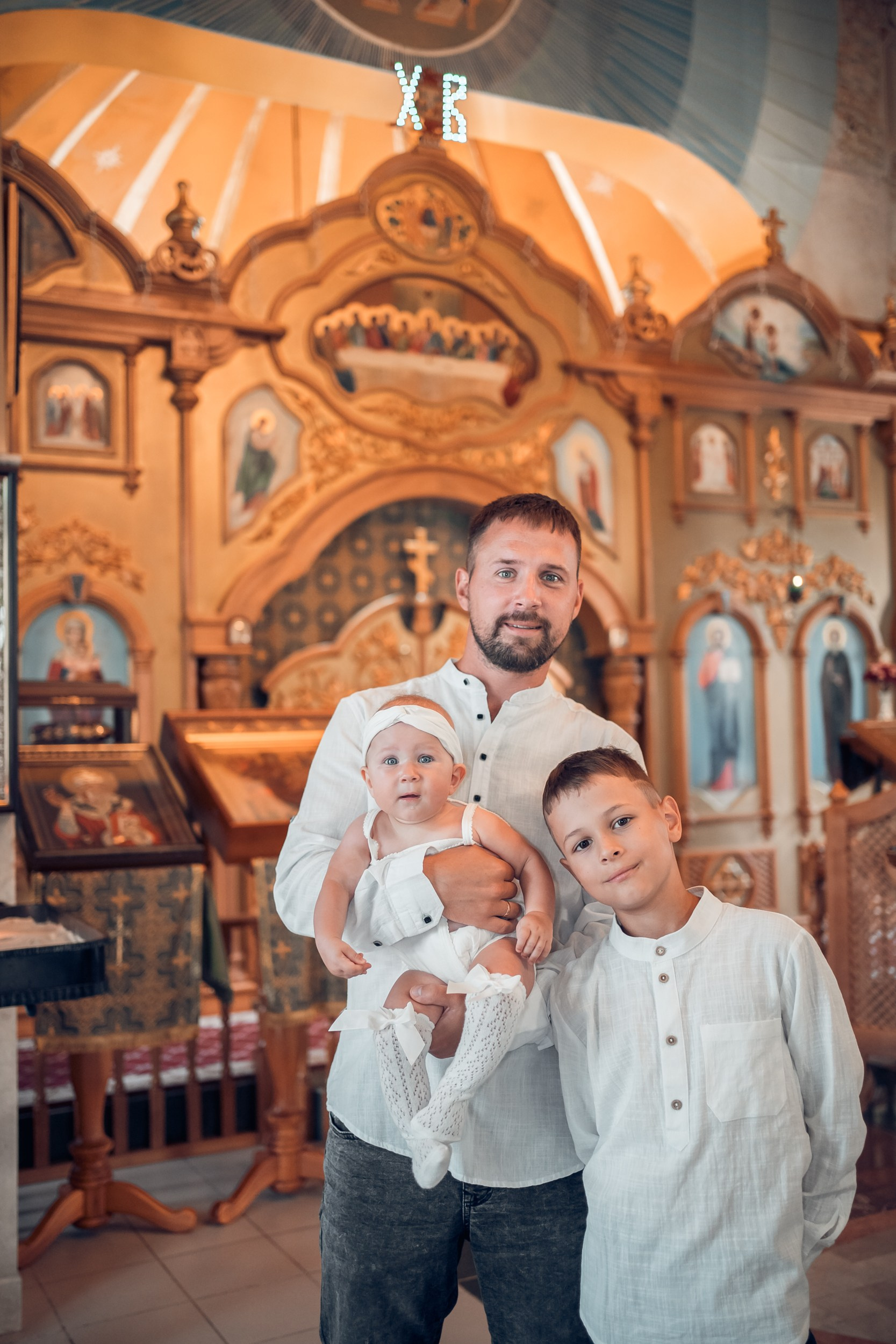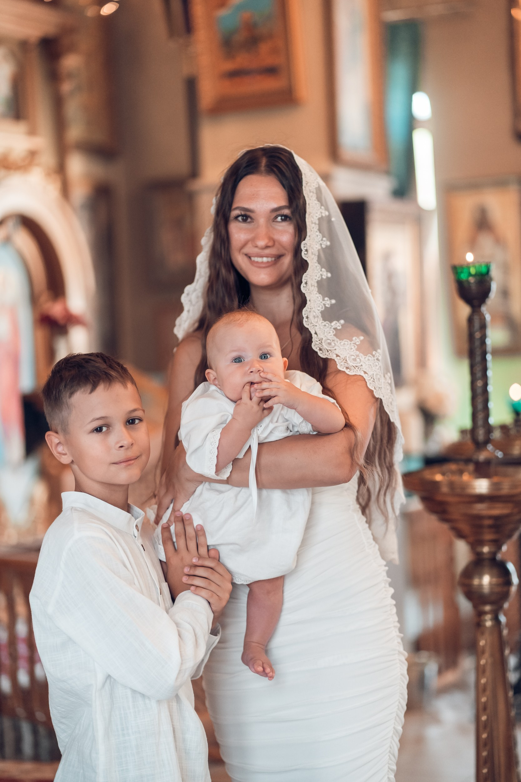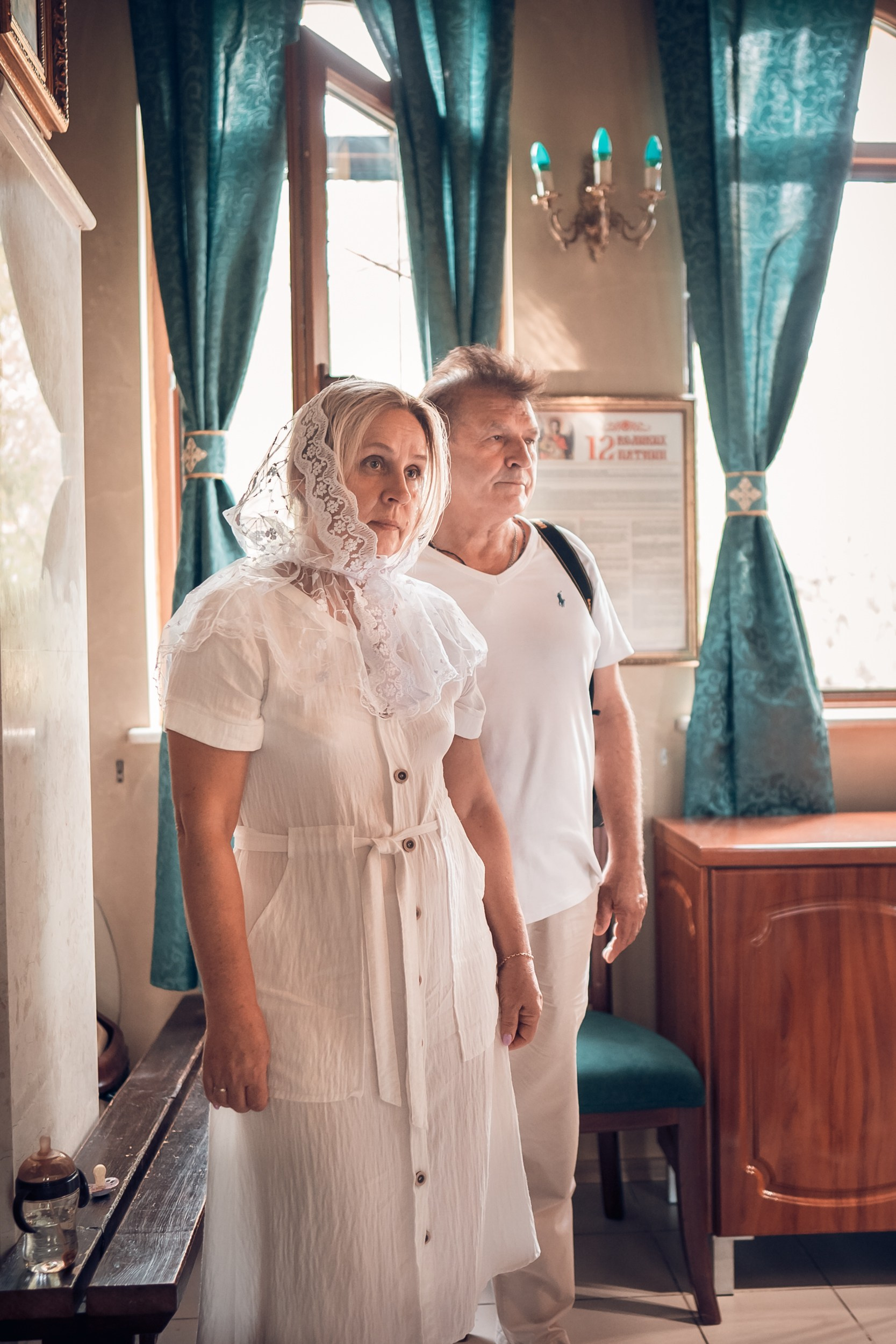 Съемка в 11 часов летнего дня. Стоит учесть. что в храме темные стены и минимальное освещение, поэтому для результата съемки обязательный выбор одежды светлых однотонных расцветок. Для малыша одежда светлых оттенков, наряд до окунания в купель и после купели крестильная рубашка (желательно фасон длинный без капюшона и завязок). Полотенце (крыжма) для принятия крещаемого из купели. Крестик на веревочке. Дополнительно пеленку однотонную.