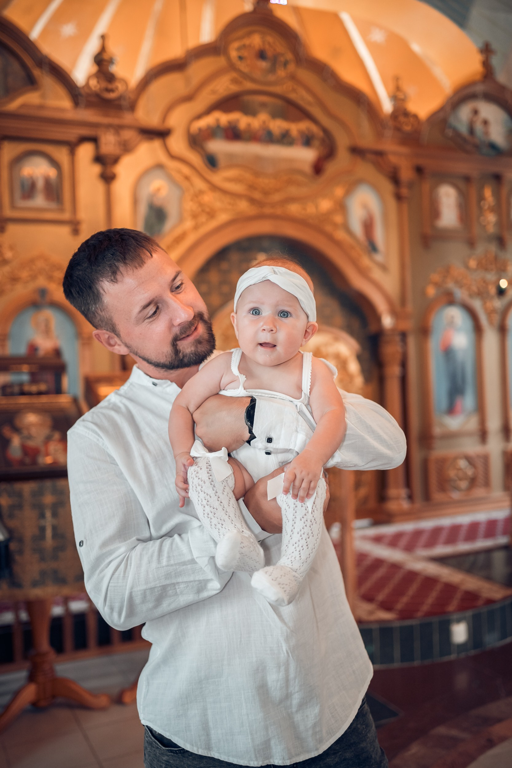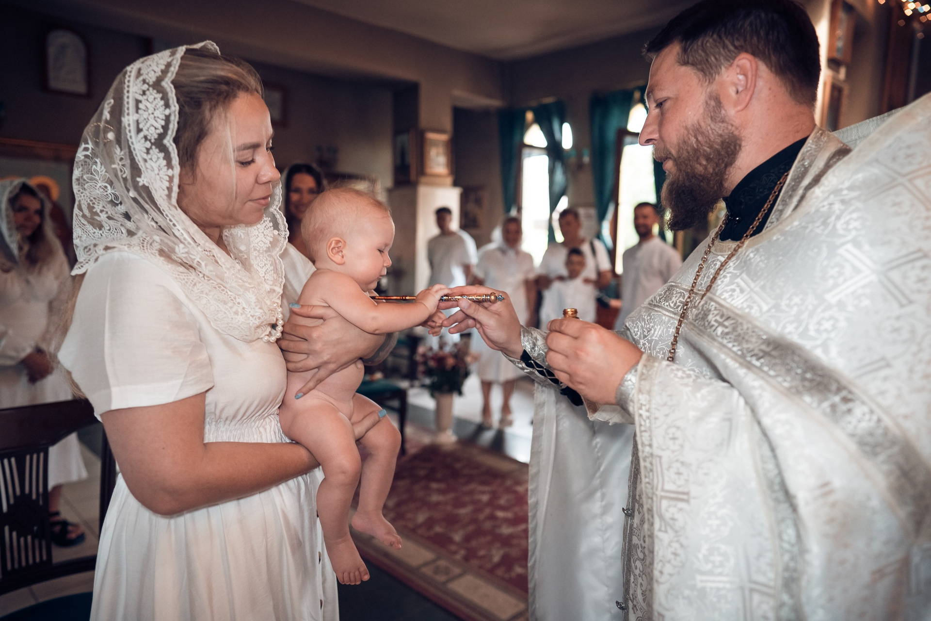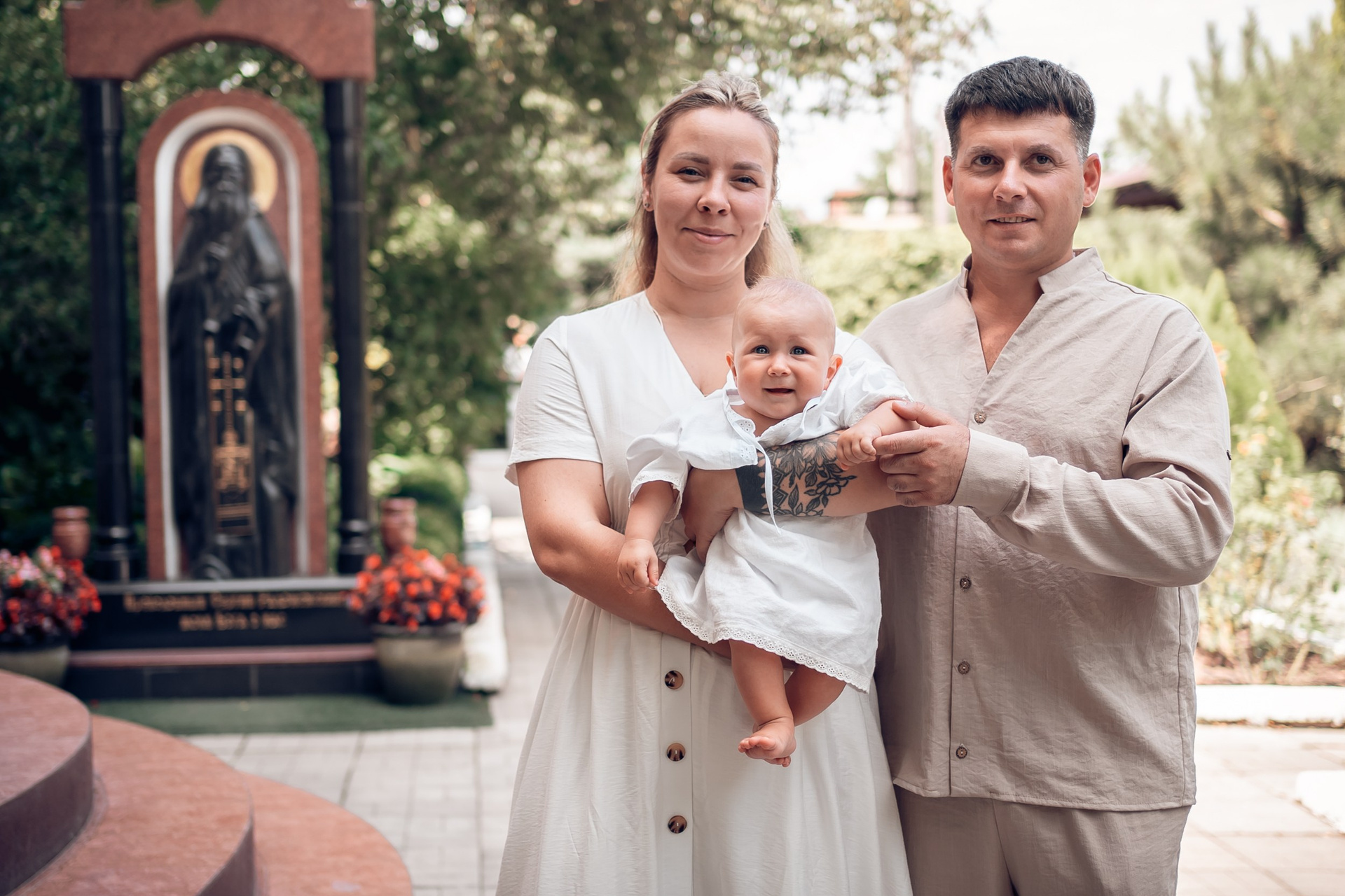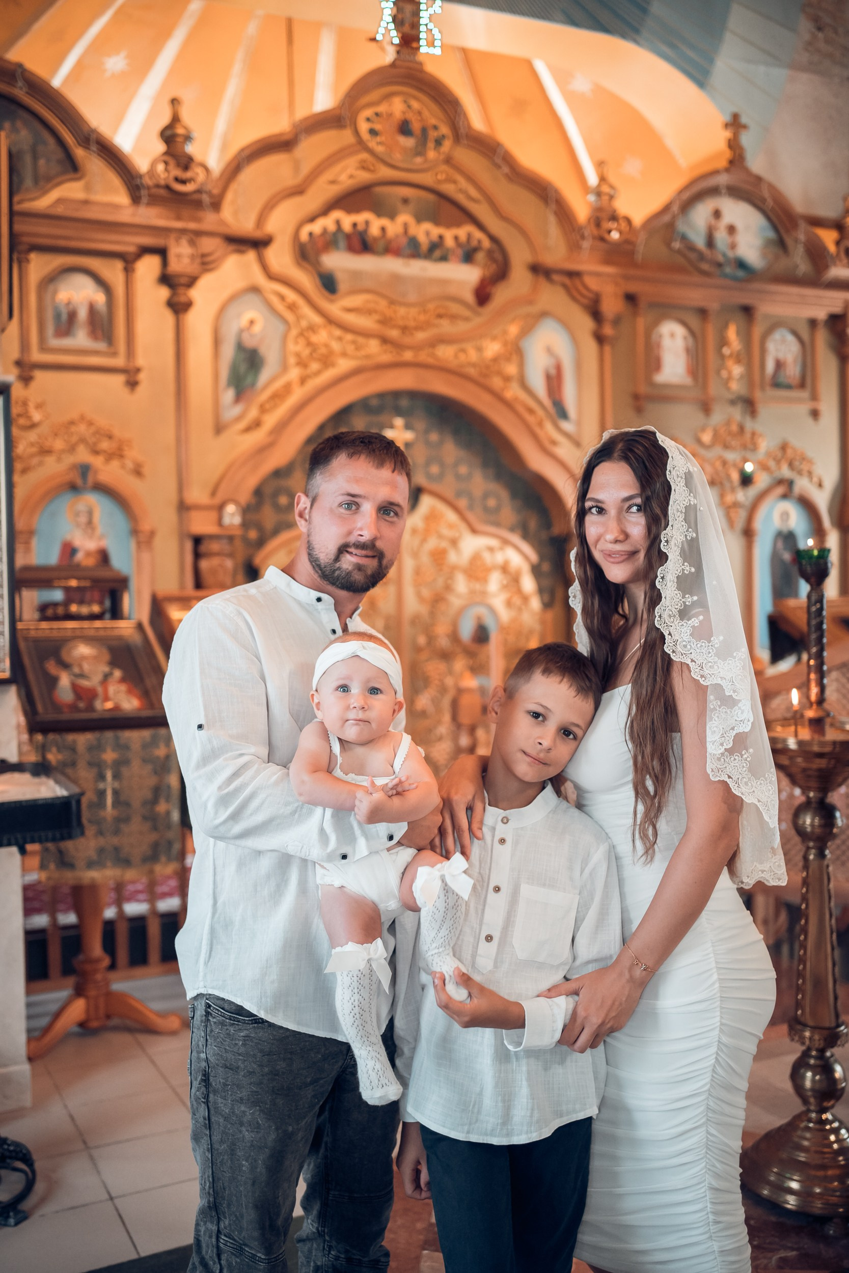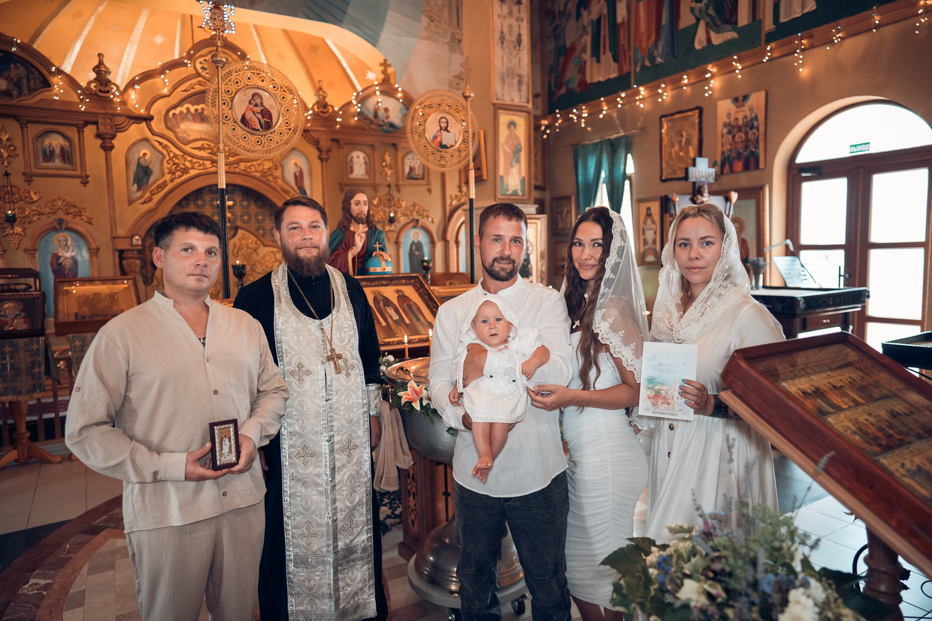Съемка в 11 часов летнего дня. Стоит учесть. что в храме темные стены и минимальное освещение, поэтому для результата съемки обязательный выбор одежды светлых однотонных расцветок. Для малыша одежда светлых оттенков, наряд до окунания в купель и после купели крестильная рубашка (желательно фасон длинный без капюшона и завязок). Полотенце (крыжма) для принятия крещаемого из купели. Крестик на веревочке. Дополнительно пеленку однотонную.