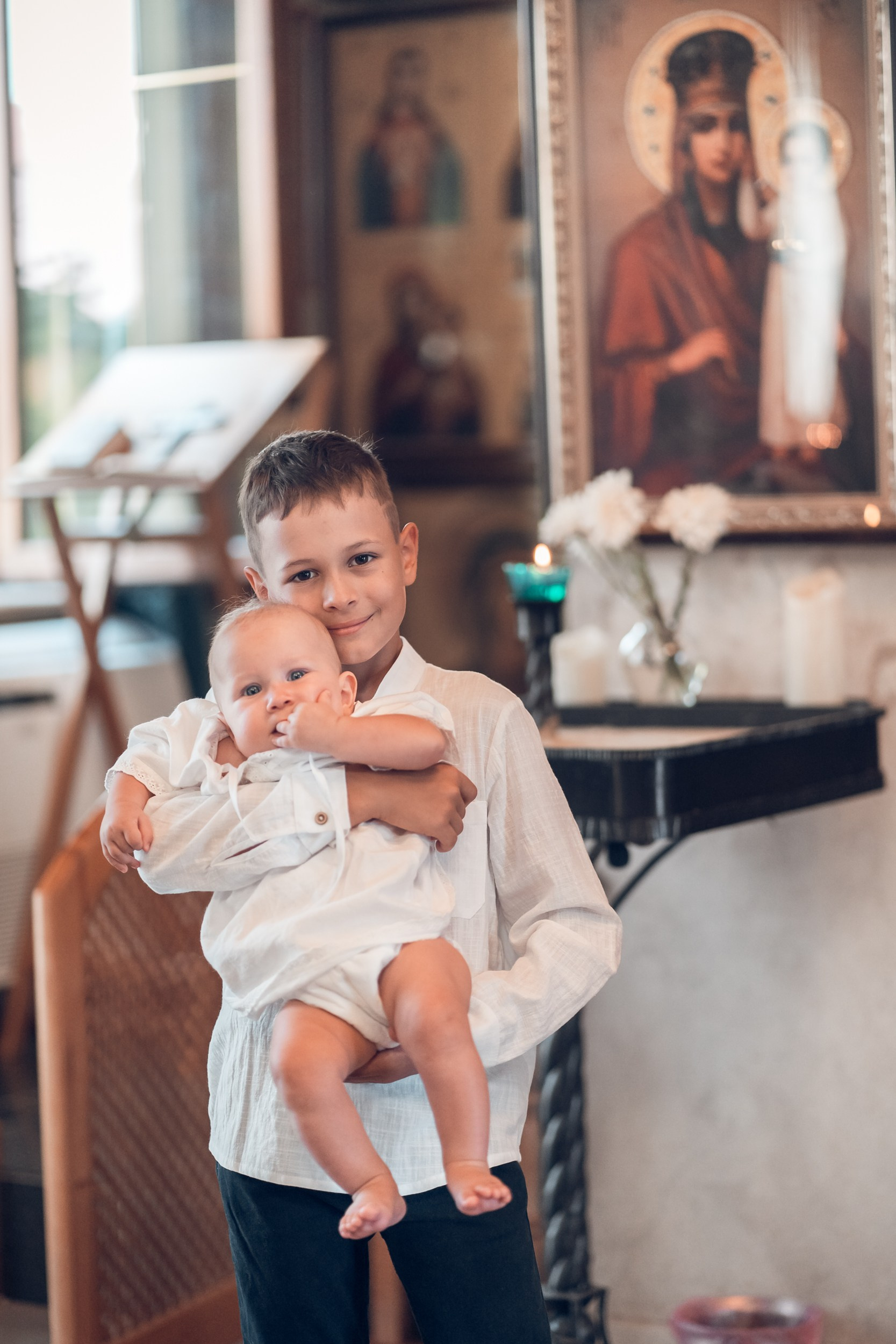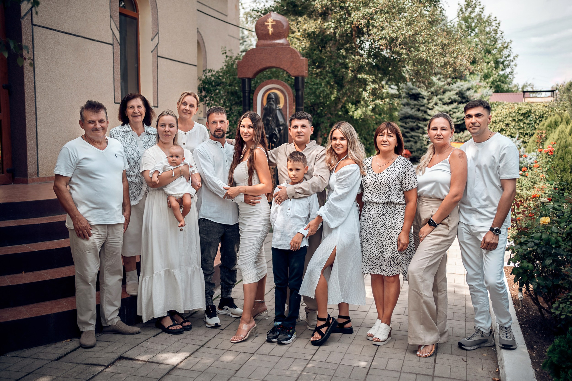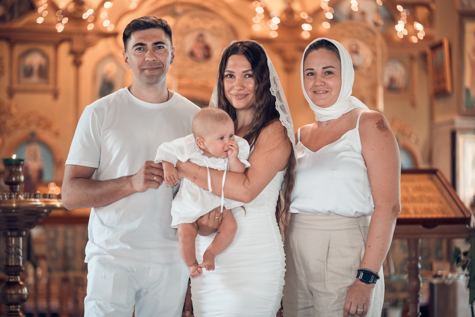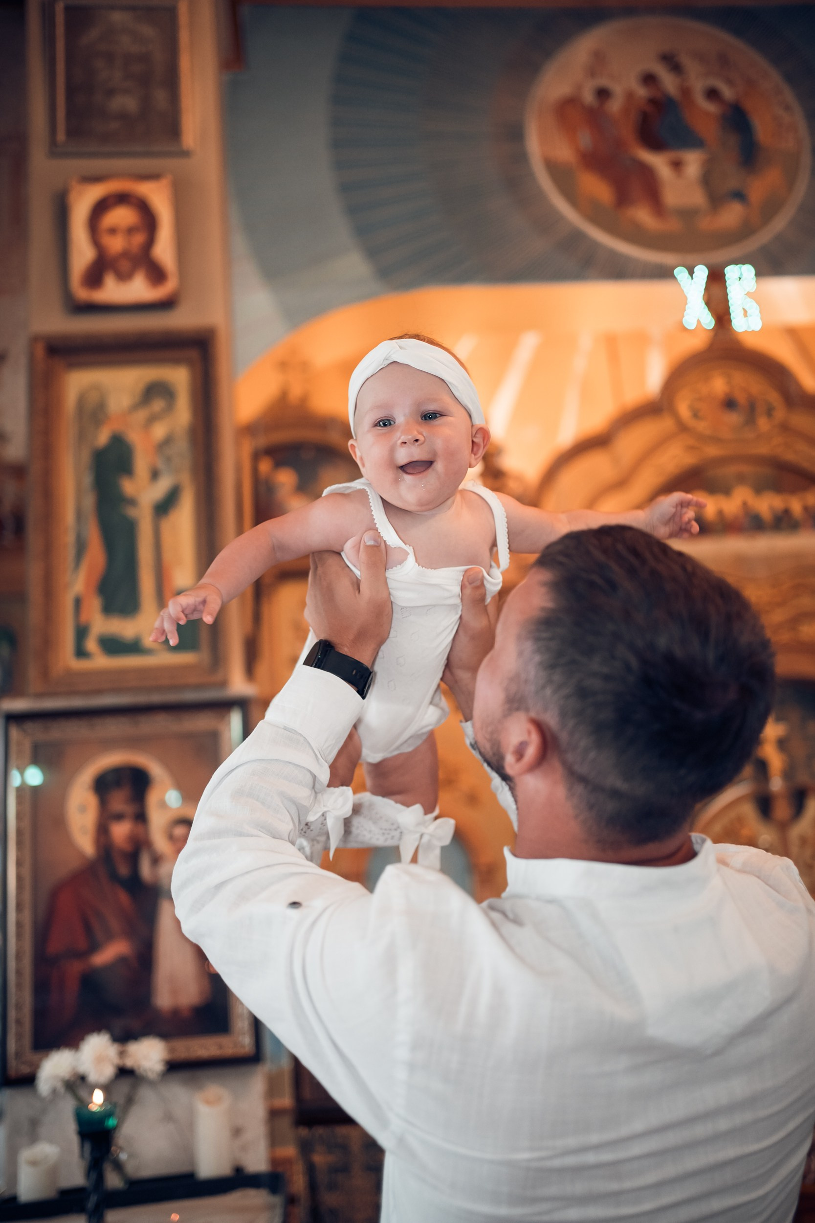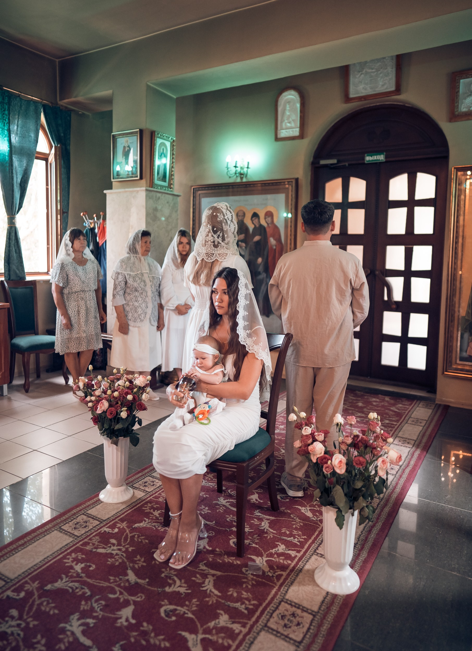 Съемка в 11 часов летнего дня. Стоит учесть. что в храме темные стены и минимальное освещение, поэтому для результата съемки обязательный выбор одежды светлых однотонных расцветок. Для малыша одежда светлых оттенков, наряд до окунания в купель и после купели крестильная рубашка (желательно фасон длинный без капюшона и завязок). Полотенце (крыжма) для принятия крещаемого из купели. Крестик на веревочке. Дополнительно пеленку однотонную.