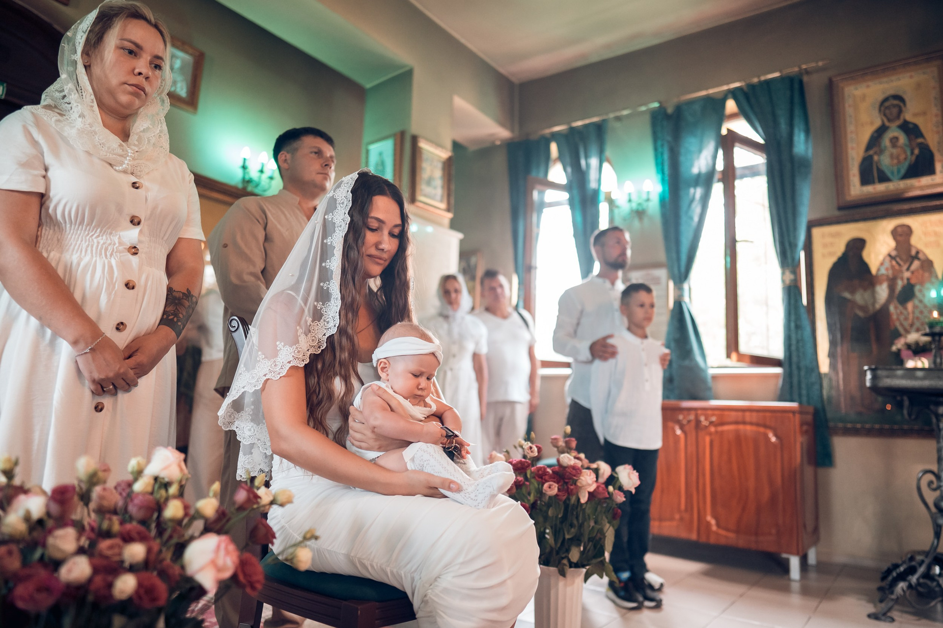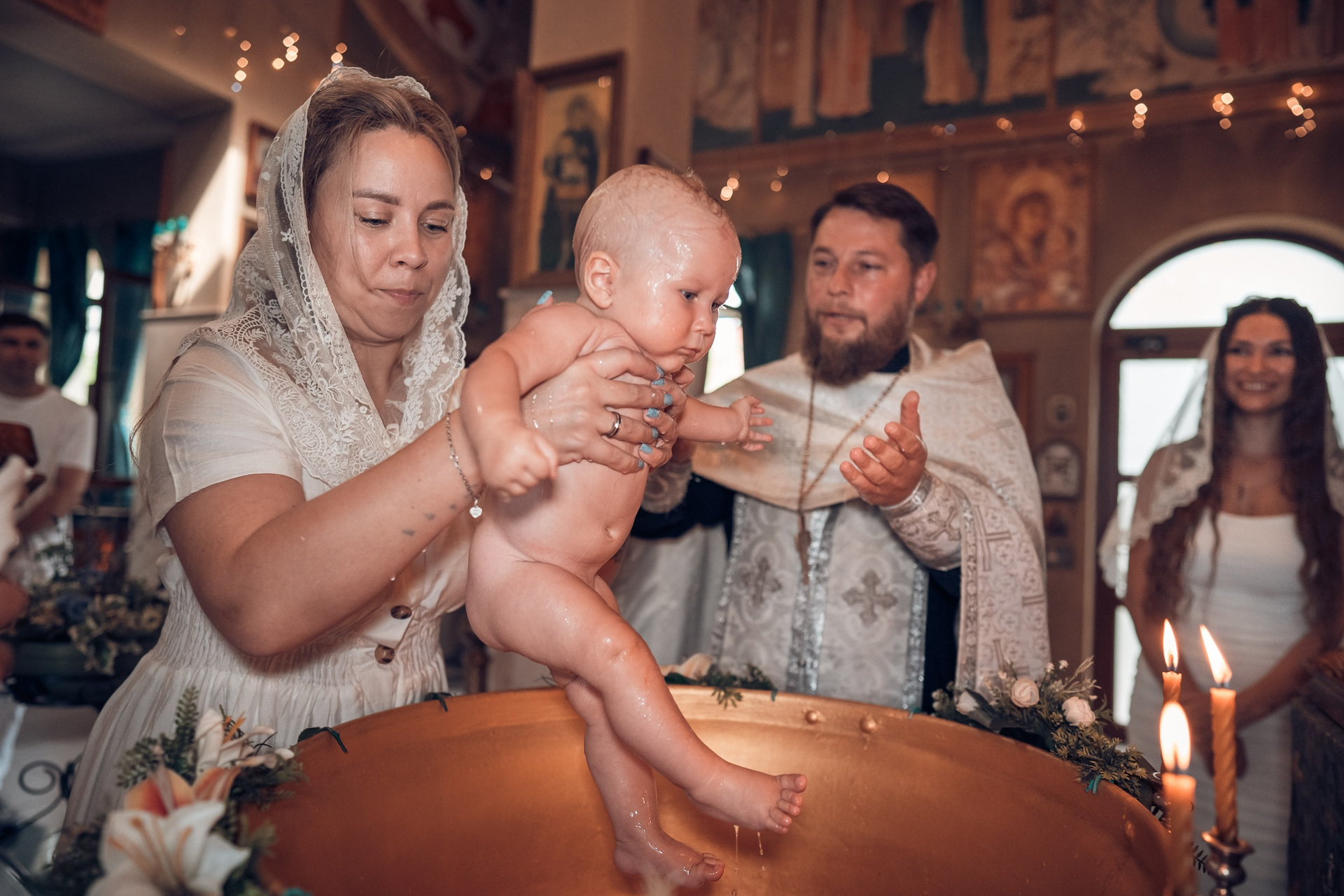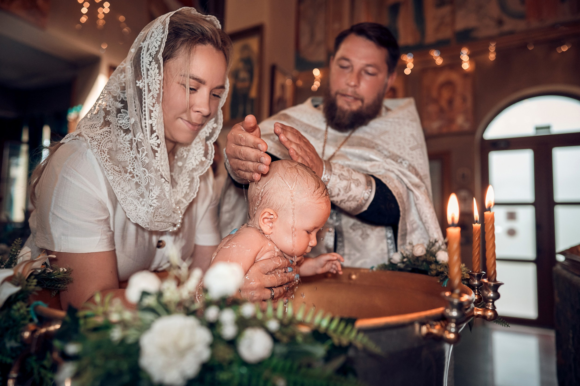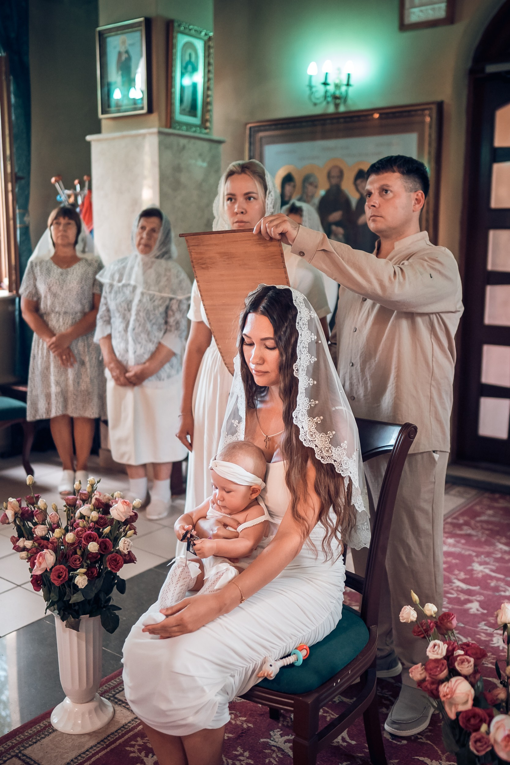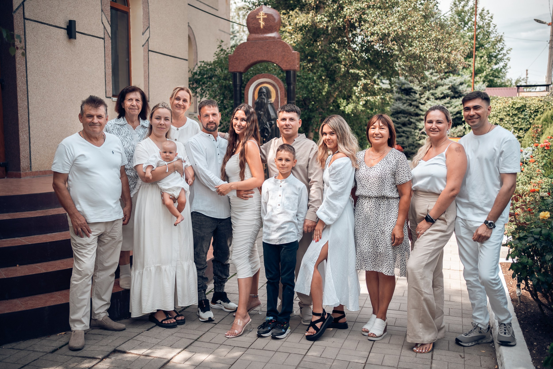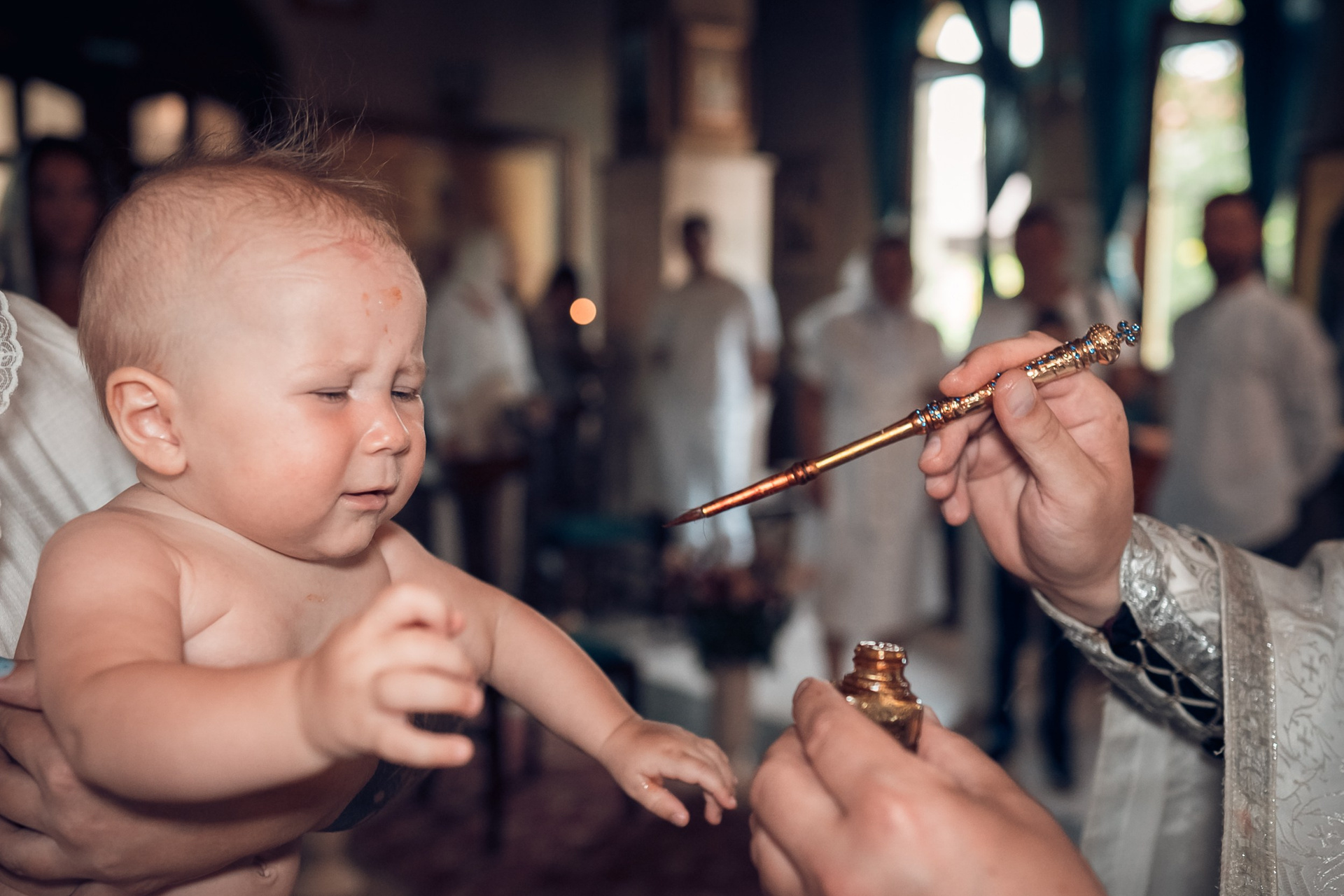 Съемка в 11 часов летнего дня. Стоит учесть. что в храме темные стены и минимальное освещение, поэтому для результата съемки обязательный выбор одежды светлых однотонных расцветок. Для малыша одежда светлых оттенков, наряд до окунания в купель и после купели крестильная рубашка (желательно фасон длинный без капюшона и завязок). Полотенце (крыжма) для принятия крещаемого из купели. Крестик на веревочке. Дополнительно пеленку однотонную.