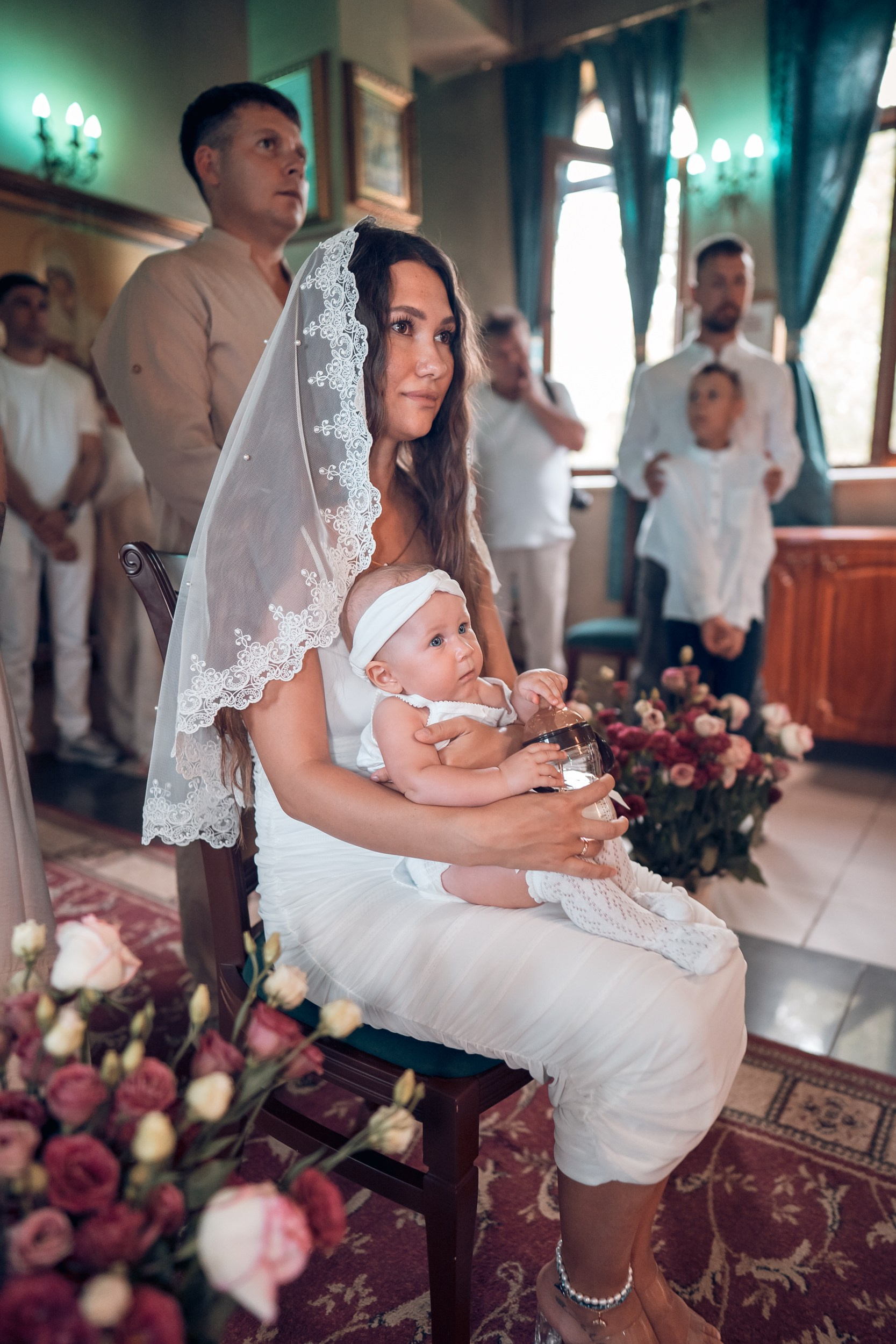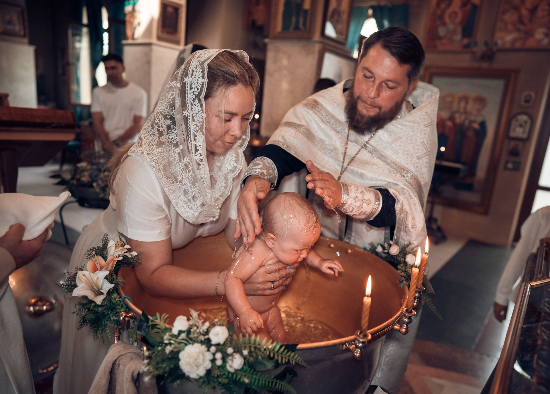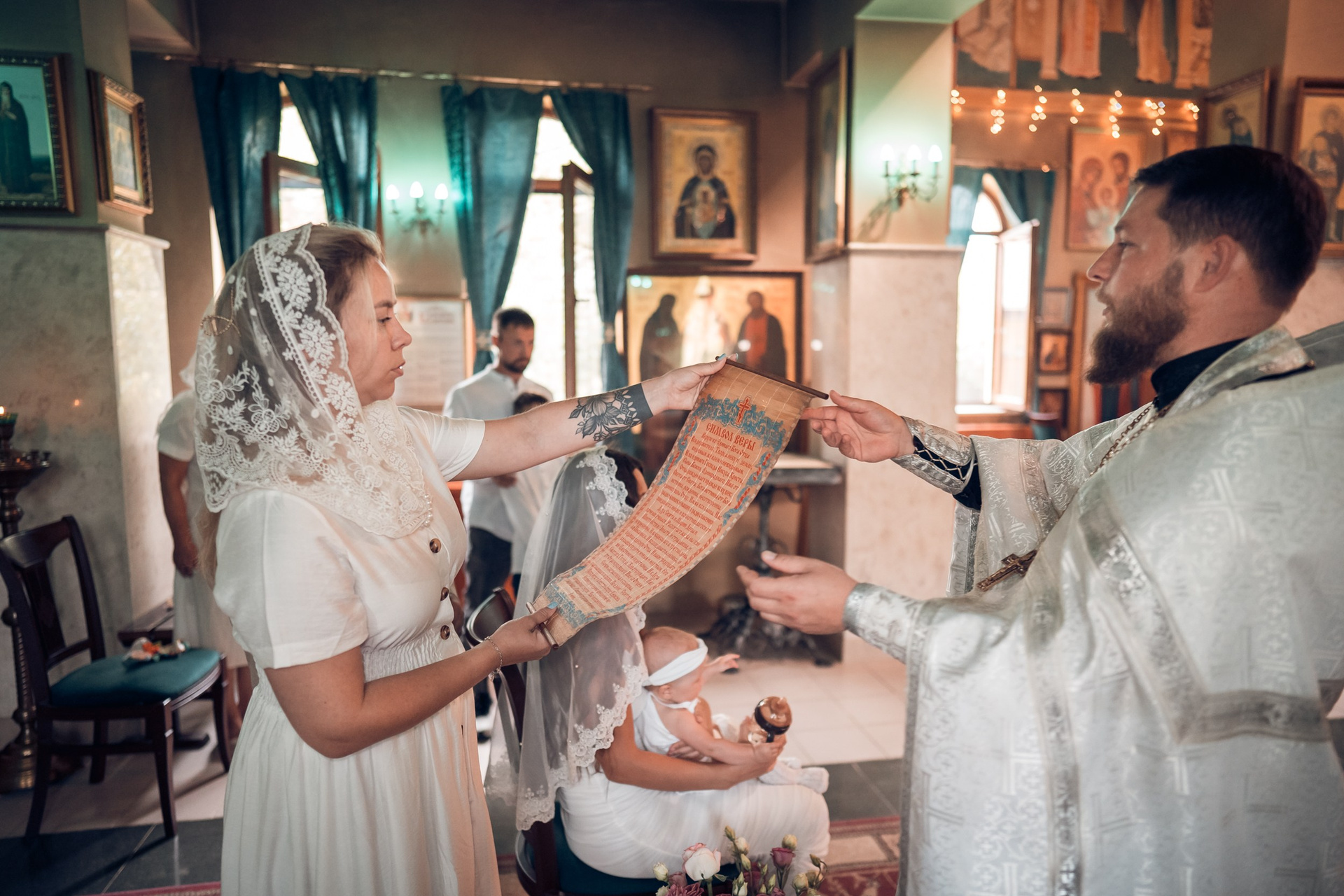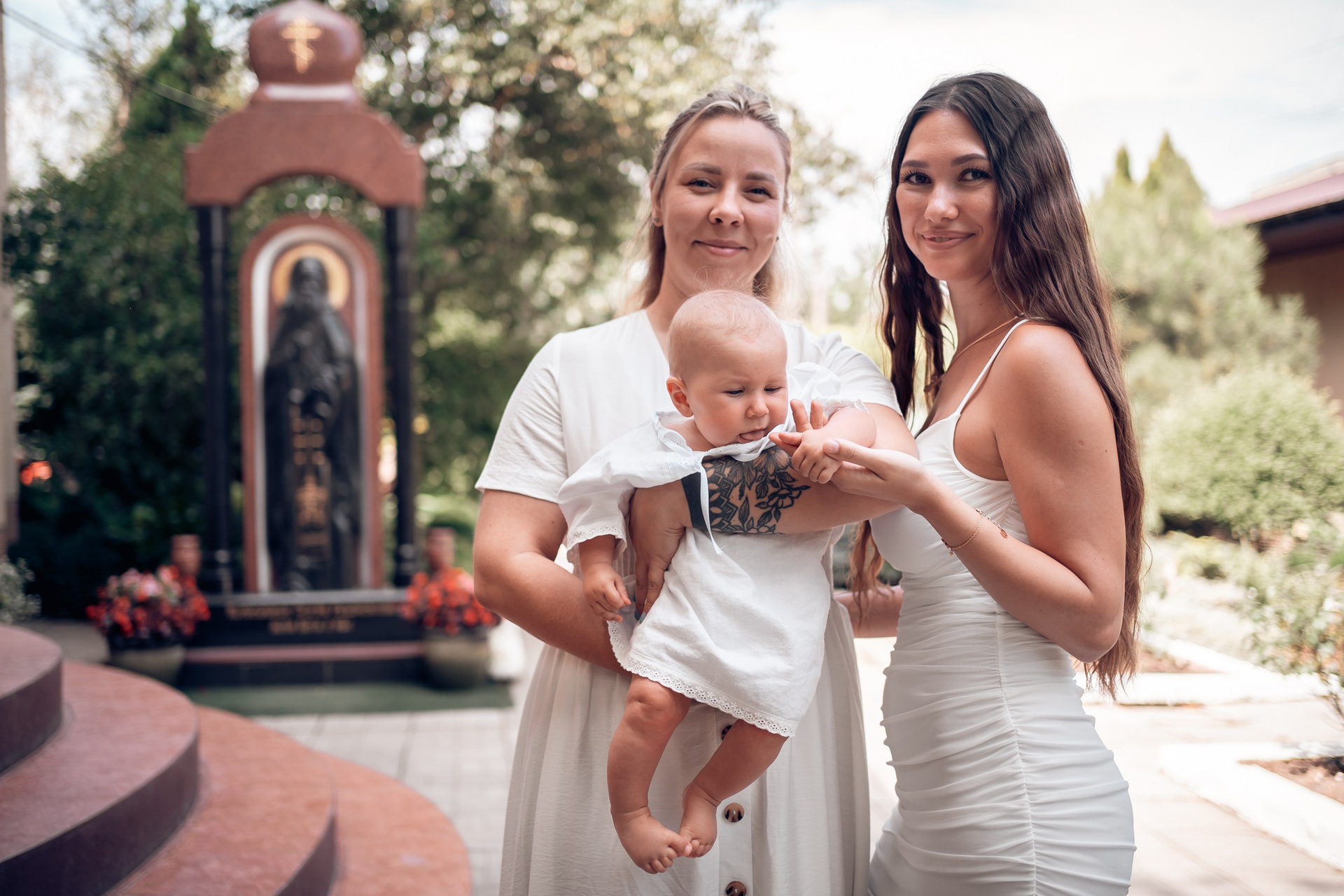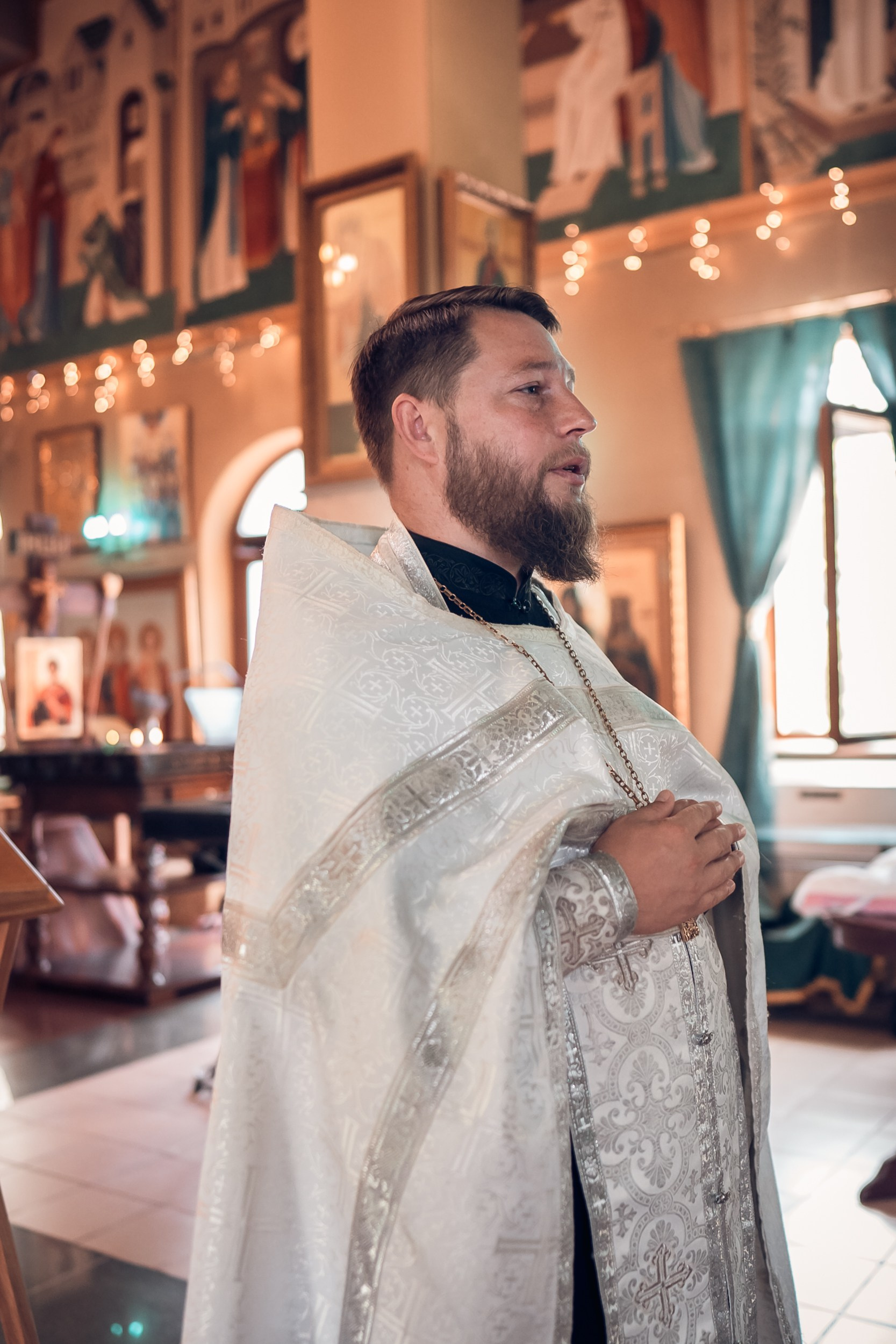Съемка в 11 часов летнего дня. Стоит учесть. что в храме темные стены и минимальное освещение, поэтому для результата съемки обязательный выбор одежды светлых однотонных расцветок. Для малыша одежда светлых оттенков, наряд до окунания в купель и после купели крестильная рубашка (желательно фасон длинный без капюшона и завязок). Полотенце (крыжма) для принятия крещаемого из купели. Крестик на веревочке. Дополнительно пеленку однотонную.